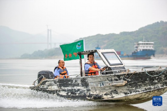 鴻鵠護魚志愿隊隊長劉鴻(右)帶領隊員在長江重慶江津段巡護(2022年9月2日攝)。新華社記者 黃偉 攝