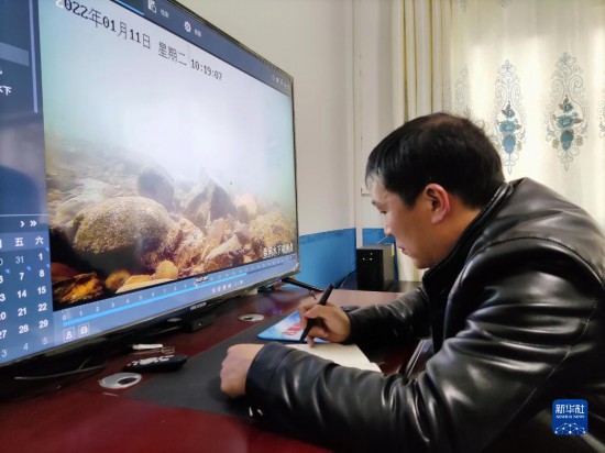 工作人員在云南省昭通市鎮雄縣魚洞生態觀測點記錄監測情況(2022年1月11日攝)。新華社記者 林碧鋒 攝